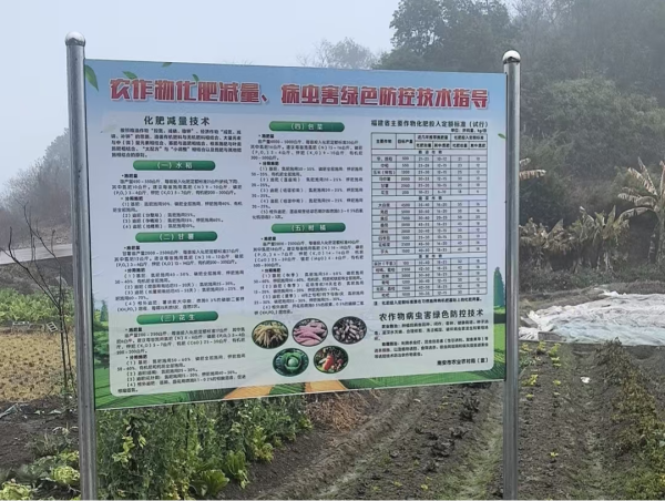 宣传牌清晰梳理了水稻、甘薯、花生等本地常见农作物定额施肥指导意见,明确每种作物化肥投入定额标准、施肥配方和施肥技术要点,同时相应详解作物的病虫害绿色防控技术。通过可视化的技术指导,引导农户合理把控施肥量、选用绿色防控技术,提升科学种植水平,从生产源头降低农业面源污染,为饮用水源地的生态安全织密了农业防护网,保障饮用水安全。