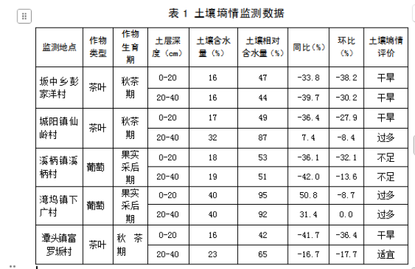 监测点种植作物茶叶当前处于秋茶期、葡萄处于果实采后期,监测点土壤0-20cm含水量平均为21%,相对含水量平均为57%,环比下降26.9%;监测点土壤20-40cm含水量平均为26%,相对含水量平均为68%,环比下降12.8%。