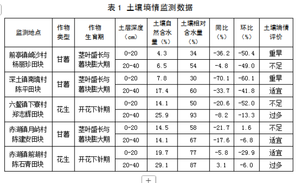 当前,漳浦县花生进入开花下针期,甘薯进入茎叶盛长与薯块膨大期。监测点土壤0-20cm自然含水量平均为12.1%,相对含水量平均为50.0%,同比减少32.9%,环比减少39.6%;监测点土壤20-40cm自然含水量平均为18.6%,相对含水量平均为72%,同比减少12.8%,环比减少21.6%。