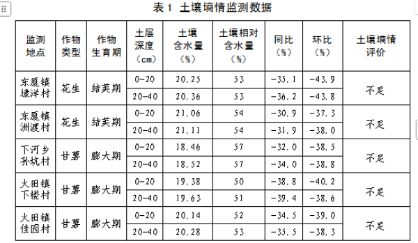 本次监测地块作物花生、甘薯,其监测结果平均为:0-20cm土壤含水量为19.86%,相对含水量为53.15%,同比下降34.25%,环比下降39.79%;20-40cm土壤含水量为19.98%,相对含水量为53.48%,同比下降35.4%,环比下降39.5%。