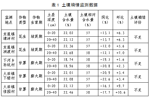 本次监测地块作物花生、甘薯,其监测结果平均为:0-20cm土壤含水量为21.45%,相对含水量为57.3%,同比下降16.41%,环比上升5.33%;20-40cm土壤含水量为21.66%,相对含水量为57.8%,同比下降17.38%,环比上升5.93%。