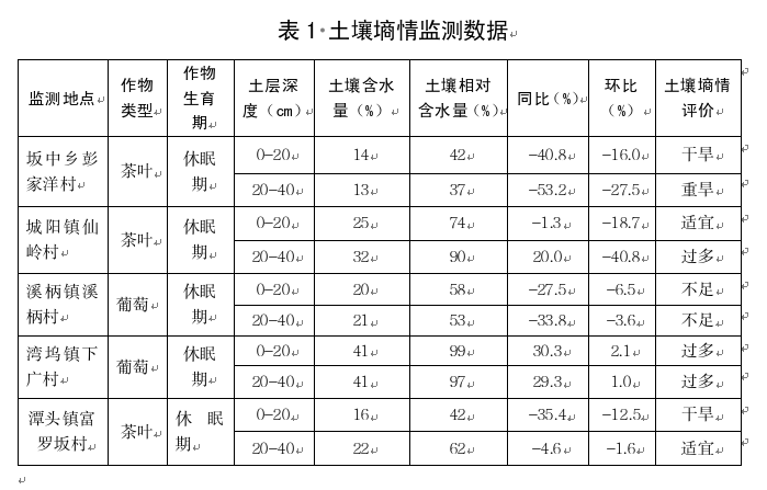 监测点种植作物茶叶、葡萄当前均处于休眠期,监测点土壤0-20cm含水量平均为23%,相对含水量平均为63%,环比下降10.0%;监测点土壤20-40cm含水量平均为26%,相对含水量平均为68%,环比下降18.0%。