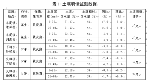 本次监测地块作物花生、甘薯,其监测结果平均为:0-20cm土壤含水量为21.3%,相对含水量为57.0%,同比下降0.53%,环比下降0.6%;20-40cm土壤含水量为21.6%,相对含水量为57.6%,同比下降2.21%,环比下降0.45%。