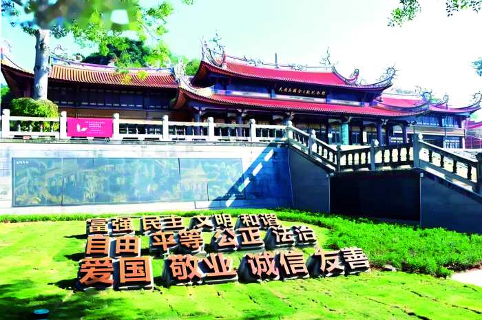 作为泉州首批爱国主义教育基地和研学阵地,公园融入特色文化元素,入口鱼塘新建有“剑经”“正气堂集”雕塑,并设立“学习语金句”宣传牌,四周悬挂《英雄篇》等篇章,雕像后增设含“文”“武”二字的文化墙,提升学生研学体验,传递爱国精神。
