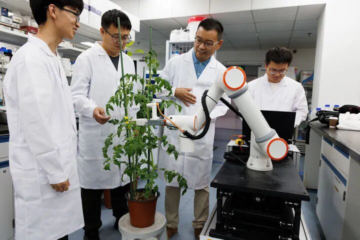 2025年8月12日,在中国科学院遗传与发育生物学研究所实验室,许操研究员(右二)和团队成员在调试智能育种机器人“吉儿”。新华社记者 金立旺 摄