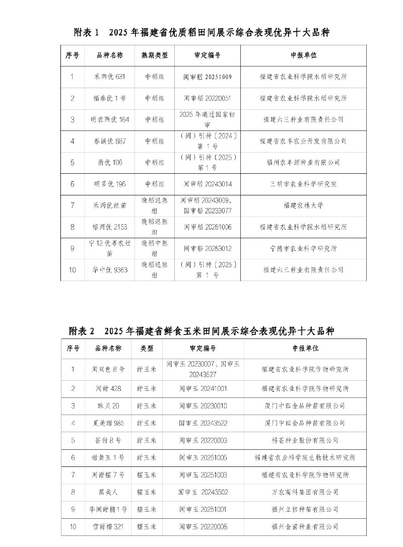 2025年我省在沙县、顺昌、浦城、上杭4个国家级优质稻新品种展示评价基地,共展示30个优质稻品种;在建瓯、永安、大田、屏南、长泰、马尾琅岐、上杭等7个省级鲜食玉米新品种展示评价点,共展示40个鲜食玉米品种(其中甜玉米20个,糯玉米20个)。根据各展示评价基地田间考种、测产验收、现场评价以及品质鉴评结果,评出2025年福建省优质稻、鲜食玉米品种田间展示综合表现优异十大品种,具体名称见附表1、附表2(排名不分先后)。